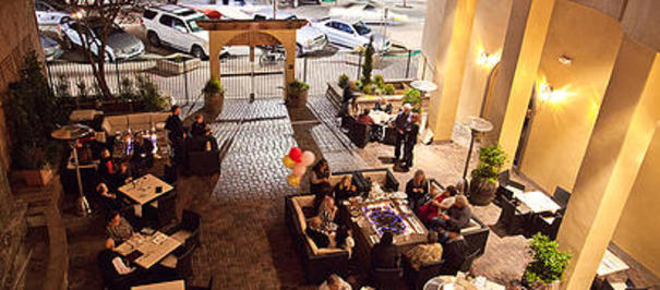 An outdoor Tuscan Piazza with TV and projector capabilities alongside fire pits, patio heaters, live foliage and a waterfall.
