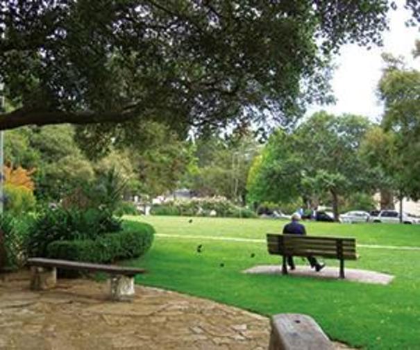 A large expanse of lawn surrounded by stone pathways, benches and shady trees. Used by Carmel public for picnics, relaxing and community events. Dogs not permitted.