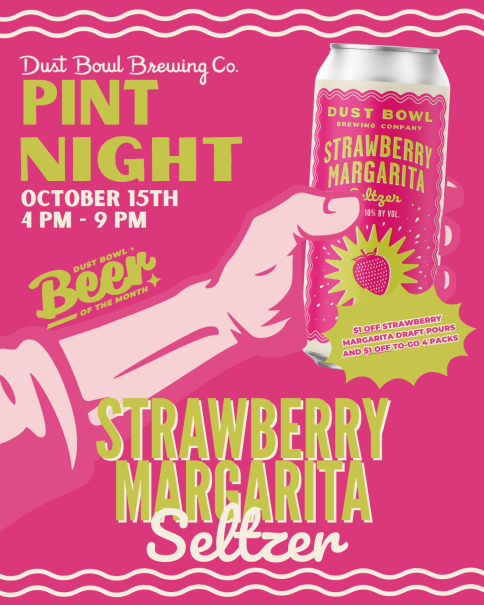 On Wednesday, October 15th, from 4:00 p.m. to 9:00 p.m., Dust Bowl Brewing Co. invites guests to all locations for Strawberry Margarita Seltzer Pint Night. Attendees will enjoy $1 off draft pours and $1 off 4-packs of the refreshing Strawberry Margarita Seltzer.