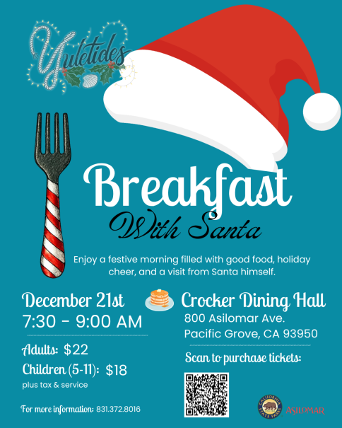 Celebrate the magic of the season by the Monterey coast! Join Asilomar for Breakfast with Santa Claus at the beautiful Crocker Dining Hall at Asilomar. Enjoy a festive morning filled with good food, holiday cheer, and a visit from Santa himself.