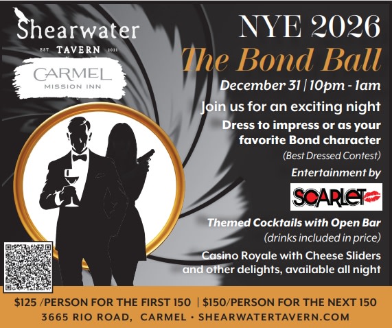 Dress to impress or as your favorite Bond character and join Shearwater Tavern and Carmel Mission Inn for an exciting night with live music by Scarlet, themed cocktails with open bar and a Best Dressed Costume Contest!